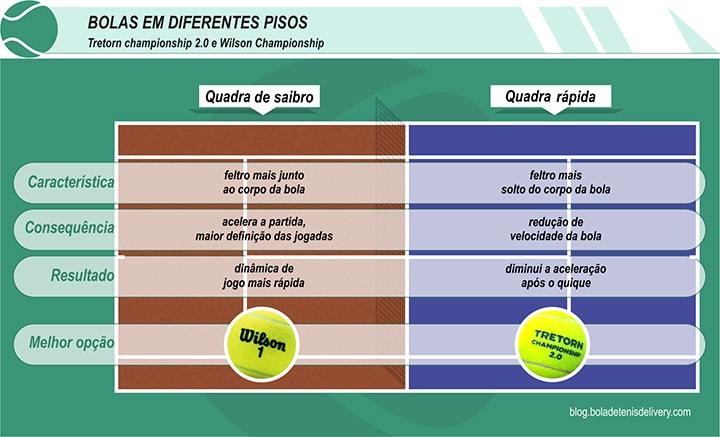 Podemos até direcionar cada bola para um tipo de quadra, pois com o feltro mais solto ou mais espesso durante a partida, a quadra ideal para esta bola seria a quadra rápida, justamente por deixar o jogo mais lento e cadenciado.